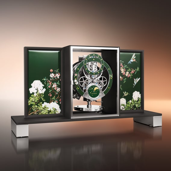 Atmos Régulateur Enamel Colibris珐琅蜂鸟规范指针空气钟,将机械精准与装饰工艺融汇一体。透过透明玻璃罩,582型规范指针机芯清晰映入眼帘,机芯两侧均饰以大明火珐琅面板。蜂鸟与繁花在纯银表盘徐徐铺开,连绵成景,缔造出沉浸式全景画面。