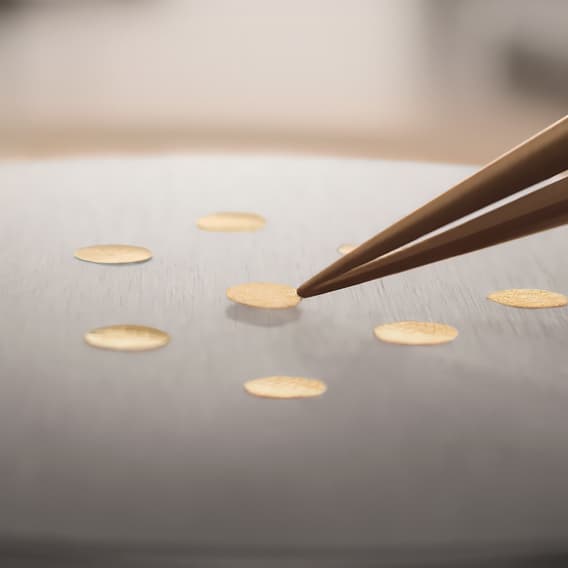 小时和分钟时标采用金箔雕花工艺精心制成。先将24K纯金金箔裁切成时标造型,再精准摆放到位,并覆以多层半透明珐琅将其密封固定。每个元素均需反复烧制,确保与表面浑然相融。这一精细过程需要臻于化境的掌控力,确保金箔既与珐琅完全相融,又完整绽放璀璨金辉。