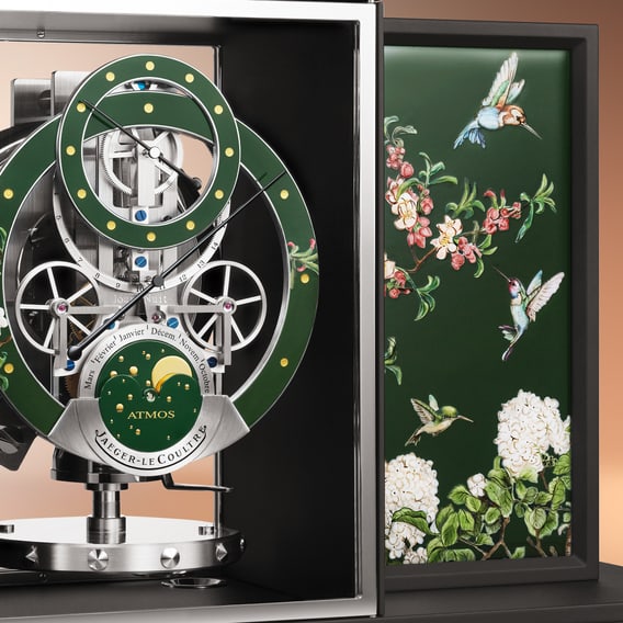 Atmos Régulateur Enamel Colibris珐琅蜂鸟规范指针空气钟,彰显珍稀工艺工作坊(Métiers Rares™ Atelier)的精湛技艺。大明火珐琅工艺令画面富有深邃层次感和迷人光泽,金箔雕花细节点缀其间,为表面赋予灵动光影。历经时光淬炼的精湛工艺,令空气钟化身名副其实的艺术杰作,匠心装饰让精准计时锦上添花。