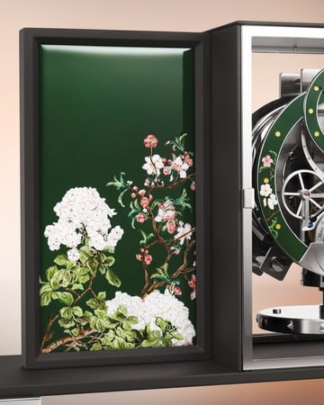 珐琅艺术画自一侧珐琅面板延展至另一侧,徐徐铺陈于银质表盘之上,全幅画作跃然呈现于透明玻璃罩内。在这副连绵不绝的风景画中,蜂鸟与繁花环绕机芯,画面和谐一体。大明火珐琅工艺与金箔雕花工艺点缀期间,为趋于恒动的机械匠心注入艺术之美。