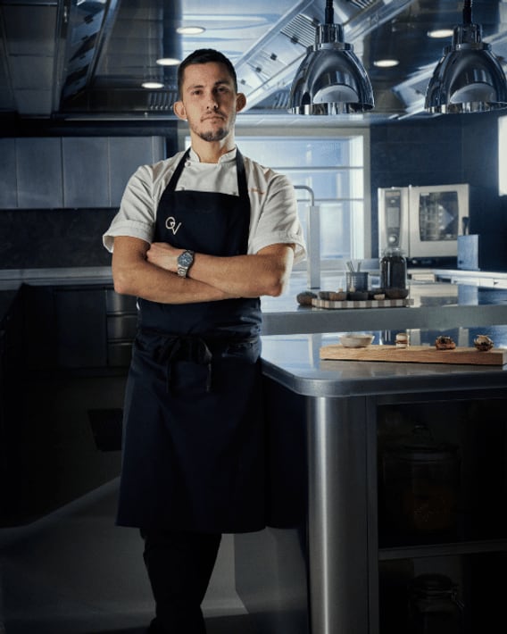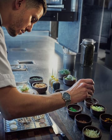 主厨吉勒斯·瓦罗纳生于瑞士瓦莱州的萨维耶斯(Savièse),也在这里长大。故乡是他的眷恋,亦指引着每一道作品的成形。他在伦敦的Trivet与Bibendum等顶尖餐厅精进厨艺,于2022年回到故乡,开设了自己的餐厅,并迅速获得米其林与高特米鲁指南的赞誉。他的美食作品根植山野采集,坚持采用本土时令食材,精准、纯粹、风味融洽,用烹饪讲述一方风物故事,巧妙呼应积家所颂扬的创新精神。