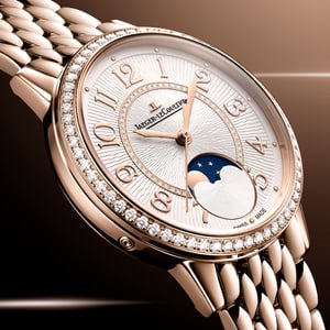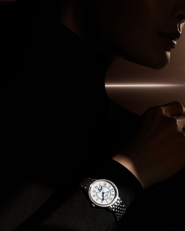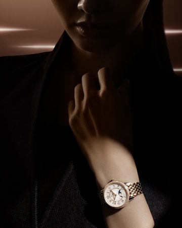伴随着Rendez-Vous Moon约会系列月相腕表的优雅运行,月相盘于视窗内悠然转动,清晰演绎月相周期的循序运转。表盘布局匠心呈现复杂功能的层次感与精致细节,彰显机械装置的优雅律动。菱形链节表链如第二层肌肤般贴合腕部,随腕间律动自然流转,尽显优雅灵动。