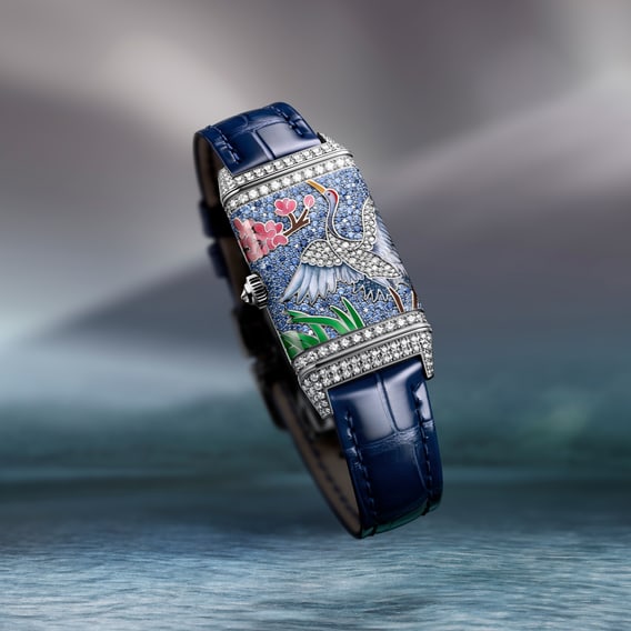 Reverso One ‘Sakura’翻转系列珍稀花卉樱花腕表以北海道静谧风光为灵感,饰以立于樱花树下的丹顶鹤,尽显自然优雅韵致。大明火内填珐琅工艺令画作栩栩如生,并以雪花镶嵌与粒镶工艺,于18K白金表壳上镶嵌269颗钻石与395颗蓝宝石,使两种独特色调相映成趣。这枚时计尽显大工坊珍稀工艺(Métiers Rares™)的非凡造诣,将珐琅与宝石镶嵌融汇于精妙画面之中。