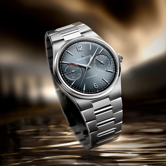 Master Control Chronometre Perpetual Calendar大师系列天文台计时万年历腕表以现代美学诠释精准之艺,采用布局协调的四个小表盘,清晰呈现月份、日期、星期与月相。精钢款搭配蓝灰色渐变太阳放射状饰纹表盘,18K玫瑰金款则配以暖色调古铜色表盘。乳白色与天蓝色饰面缔造清晰卓越的读时体验;锤纹金箔月相为表盘增添细腻质感与丰盈层次。三排式表链融汇抛光和缎面拉丝工艺,光影流转间,尽显优雅格调。