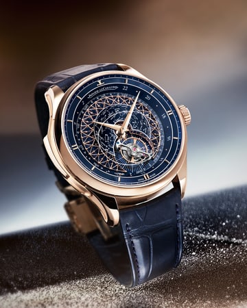 表盘中央穹顶由积家珍稀工艺工作坊(Métiers Rares™ atelier)手工装饰,覆以深蓝色大明火珐琅,并饰有转印白色星座图案,金光闪闪的顶侧精密结构稳妥固定在位。