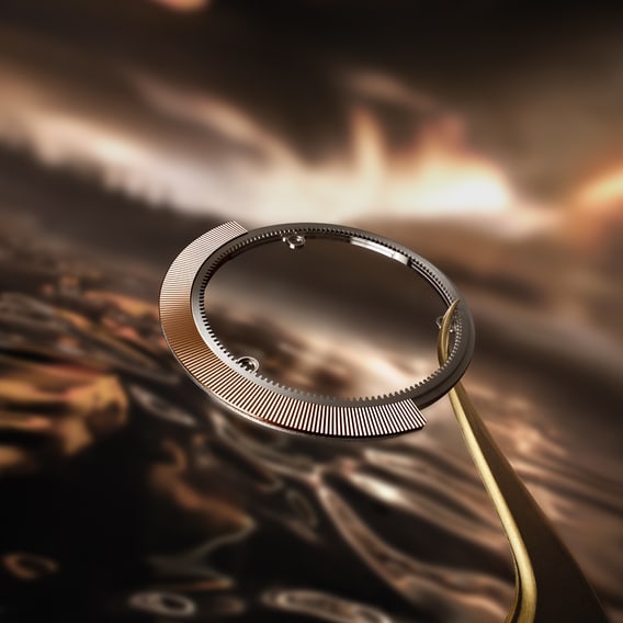 外缘式摆陀沿机芯边缘旋转,未增加丝毫厚度,亦不遮挡机芯视野。该摆陀由36枚陶瓷滚珠轴承支撑,仅凭腕部运动即可高效上链。