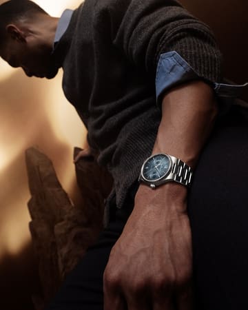 以Futurematic腕表的经典元素为灵感,蓝灰色渐变表盘与精钢表壳的清冽光泽相得益彰。一体式表链缔造浑然一体的独特外观,表链链节以抛光和缎面拉丝工艺交替呈现,将表壳的建筑元素拓展至整个腕间。