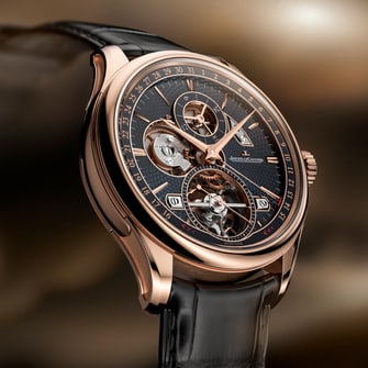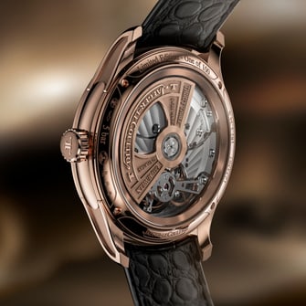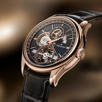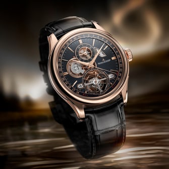 积家978型机芯搭载瞬跳日历与24小时圆盘,陀飞轮每60秒完成一周旋转。表盘视窗与机芯结构经匠心重构,悉数呈现三大功能,一目了然。