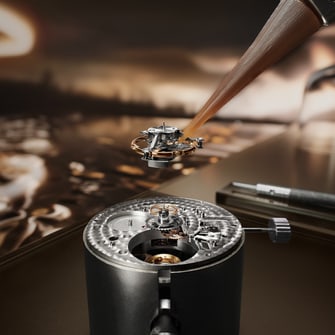 陀飞轮总重不足0.5克,位于6点位,不仅带来了赏心悦目的视觉效果,也增添了两大复杂功能:抵消地心引力干扰,并通过每60秒旋转一圈来指示秒数。