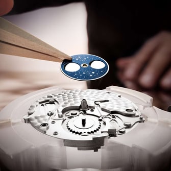 表壳线条优雅流畅,表盘布局精妙对称,尽显协调之美。银色月亮以深蓝星空为衬,赤陶色月相视窗外圈饰以黑色转印日期,在同一视窗融合月相与日期显示,布局考究,韵律有致。