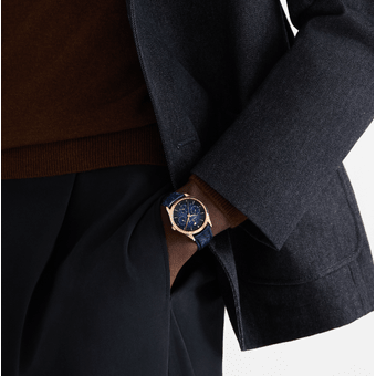 诠释现代审美,融汇精湛技艺,缔造正装腕表典范。三个精致小表盘清晰显示星期、日期和月份,结合修长的时标、太子妃式指针以及璀璨星空映衬的月相,彰显隽永优雅的时计杰作。