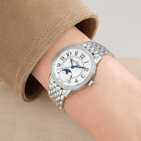 Rendez-Vous约会系列于2012年首次亮相,外观风格与复杂内芯相辅相成,作为开创性时计杰作载誉等身。纹理感玑镂饰纹、凸圆形时标、镶钻内圈、花体数字和指针——繁复精致的表盘装饰搭配精美月相复杂功能,更显迷人魅力。融合高级珠宝工艺与高级制表复杂功能,匠心诠释璀璨优雅与机械美感。