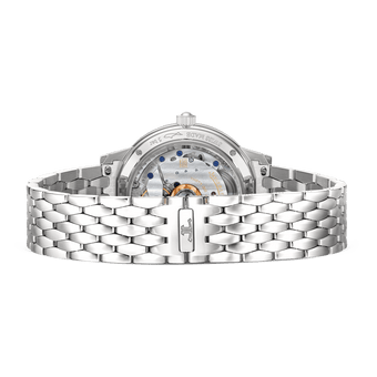 积家925型自动上链机芯在大工坊内部完成从设计、制作、装饰到组装全流程工序,搭载月相复杂功能,精妙呈现略长于29天的月相周期。动力储存长达70小时。