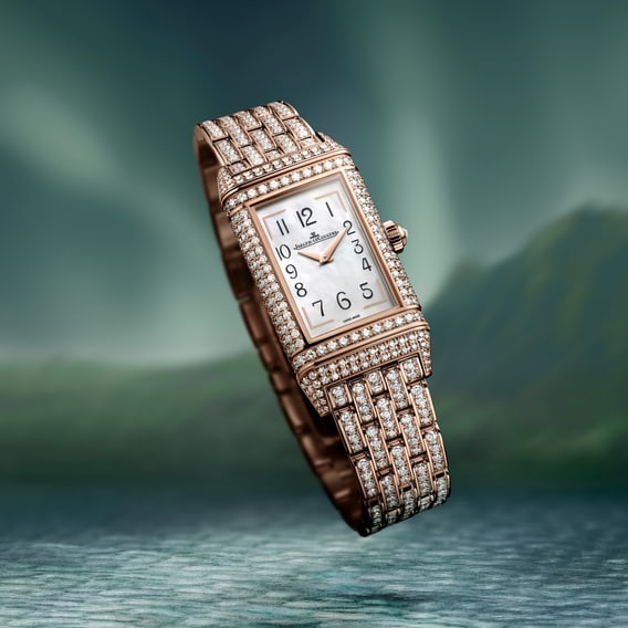 Reverso One翻转系列腕表以标志性的矩形可翻转表壳、精致的装饰艺术风格边框与珍稀材质,成为永无止境的艺术画布。珍珠母贝表盘温润细腻,镶钻表冠平添一抹经典璀璨,魅力非凡。