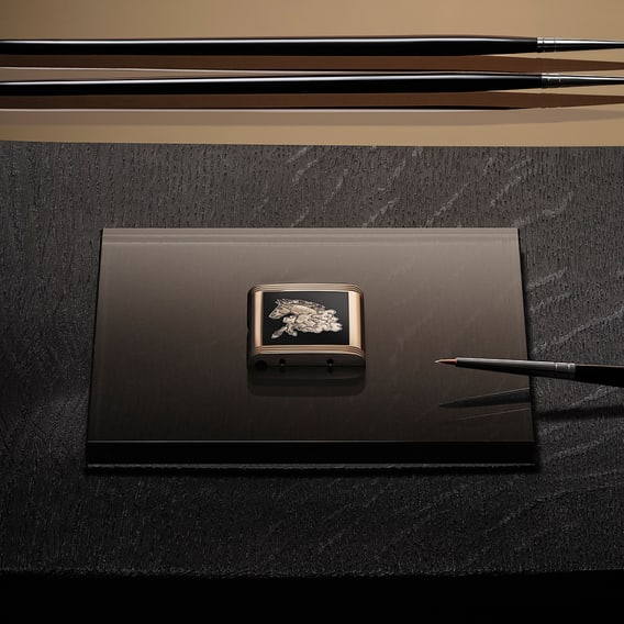 为进一步凸显镌刻图案的立体感与深邃感,镌刻师全神贯注,用10种不同尺寸的凿刀逐步雕凿金属,灵活运用对精准度有着严苛要求的“浮雕”工艺。表盘与表背同样覆盖不透明黑色大明火珐琅,匠心实现纯粹色彩的统一。